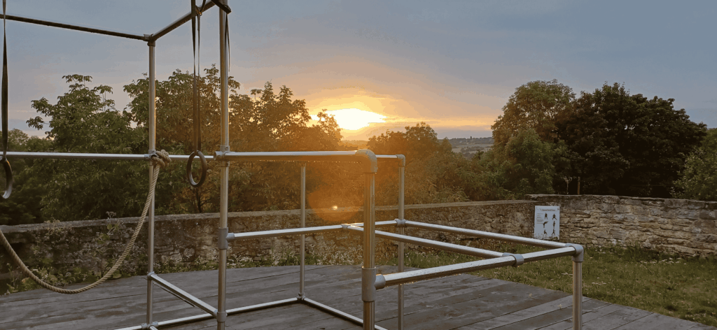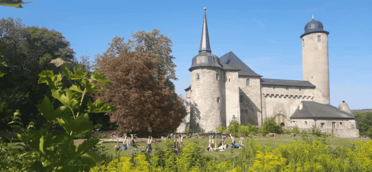 Auf unserer Sportparktour trainieren Sie in unserem weitläufigen Freigelände um die Burg in freier Natur an 14 verschiedenen Stationen Ausdauer, Beweglichkeit, Kraft und Geschicklichkeit. Die Übungen sind ausgewogen angeordnet; teils als gymnastische Körperübungen, teils an Geräten wie Barren, Reck, Ringen oder Slackline. Ein Jogging/Nordic-Walking Pfad durch den Barockgarten ergänzt die Trainingsstationen. Bei Ihrem Training an der frischen Luft erleben Sie mit allen Sinnen z.B. das Rufen des Turmfalken, den Duft der blühenden Rosen, die immer wieder neuen Perspektiven der Burggebäude; z.B. den 5-Türme. Blick vom Burganger aus. Der Parcour ist während unserer Öffnungszeiten durchgehend geöffnet.